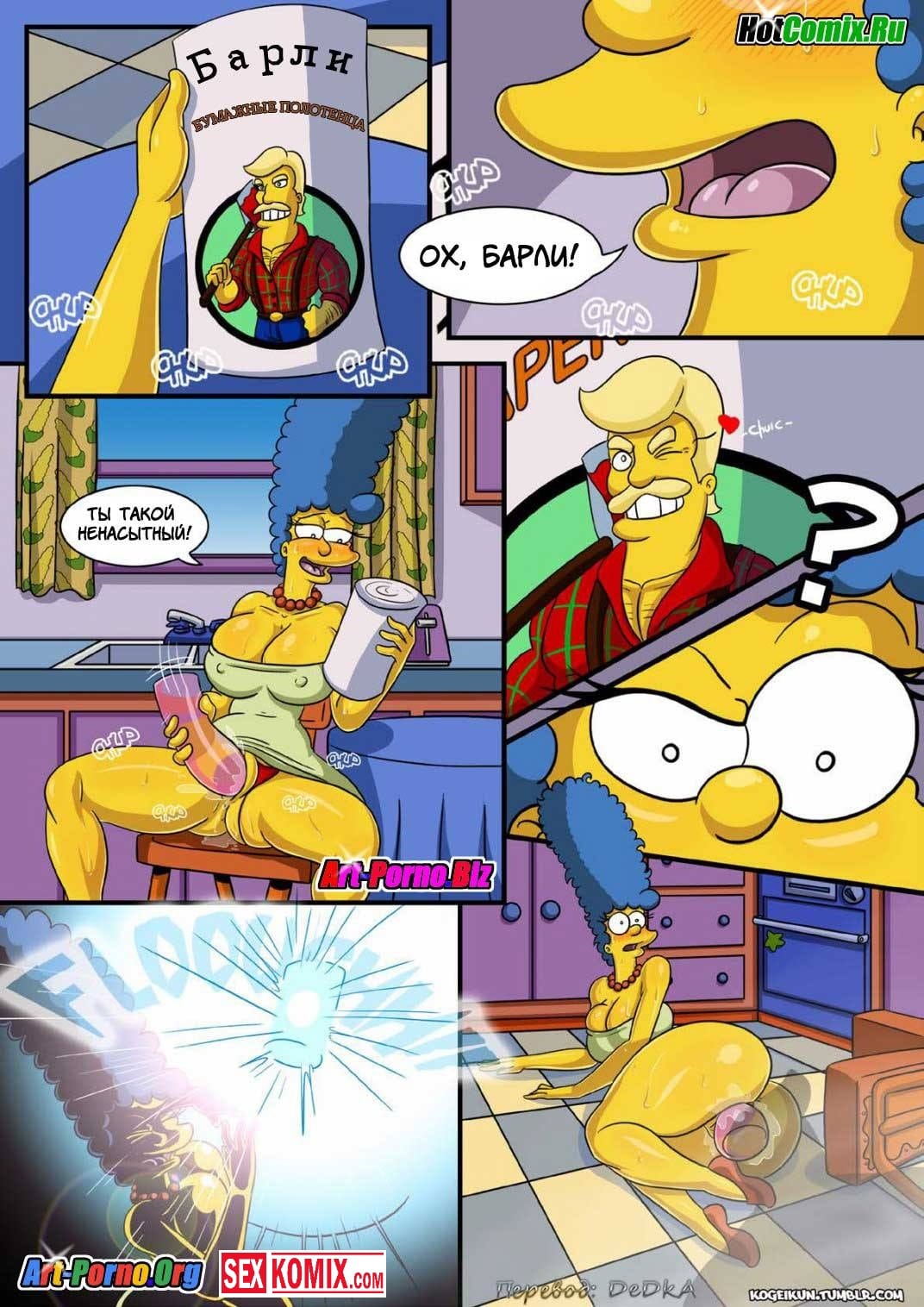 Порно комикс Эротические фантазии Мардж. Мардж очень сексуальная и возбуждающая женщина с большими сиськами, но ей совсем не хватает секса, так как Гомер и редко трахает. Вот ей попалась рулон с бумажными полотенцами, на которых была изображение сексуального мужчины с большими усами и накаченным телом. Женщина возбудилась от увиденного, ее фантазия заполнилась с этим мужчиной, она вставила свою киску резиновый член и начала представлять этого мужчину внутри себя. И вот мы видим как, он появляется в её комнате раздевается, и засовывает член в развратный рот полностью заполняя ее рот и горло.