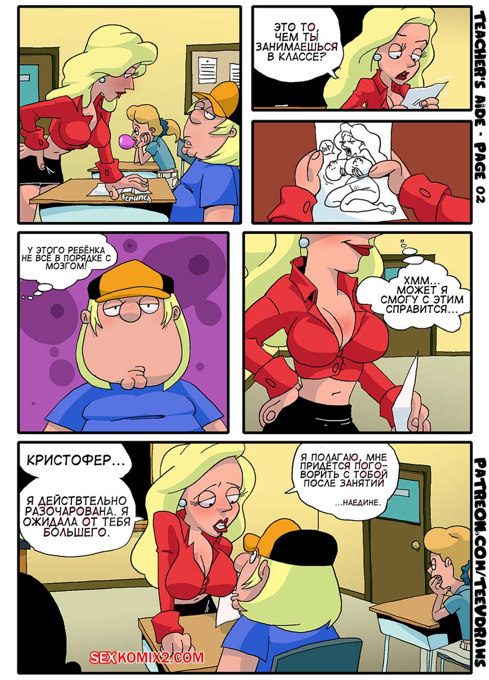 Порно комикс Гриффины. Помощник учителя. Парень залипал на занятиях и мечтал о сексе, горячая училка заметила его флюиды и возбудилась. Он подошла к нему близко, так что ее грудь оказалась перед его глазами и попросила остаться после уроков.