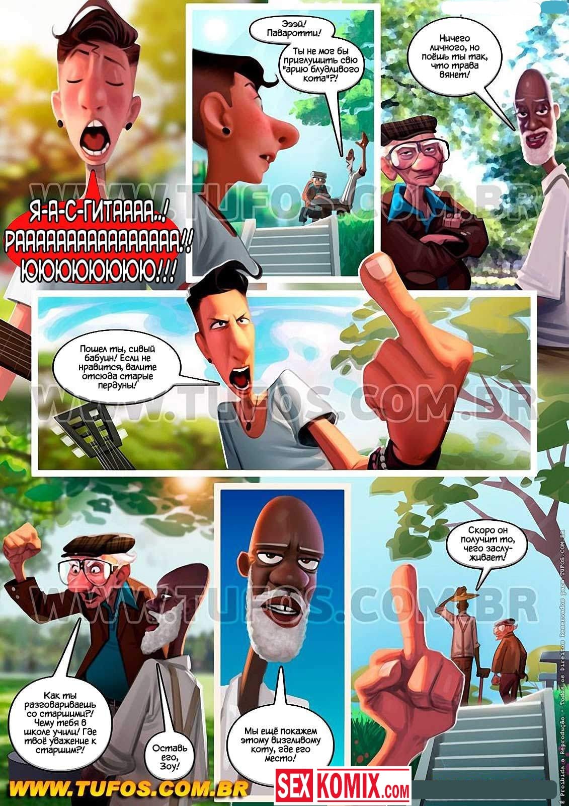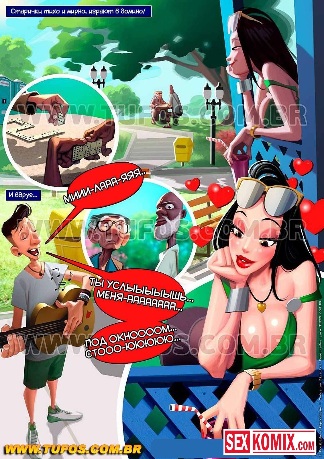 Порно комикс Удалые старички. Часть 4. Серенада любви. Двое развратных стариков продолжают свое шествие по парку, занимаясь сексом с сексуальными девушками. Однажды проходя мимо дома, они увидели, что внизу стоял парень с гитарой и пел серенаду своей возлюбленной. Но она выглянула в окно, и послала его подальше. Но мужчин, знают что девушкам нужны не серенады и песни под окном, а крепкий стоящий член. Который она засунет свою сочную киску и получит хорошее удовольствие. Именно это они ей дали, пока парень ходил за цветами.