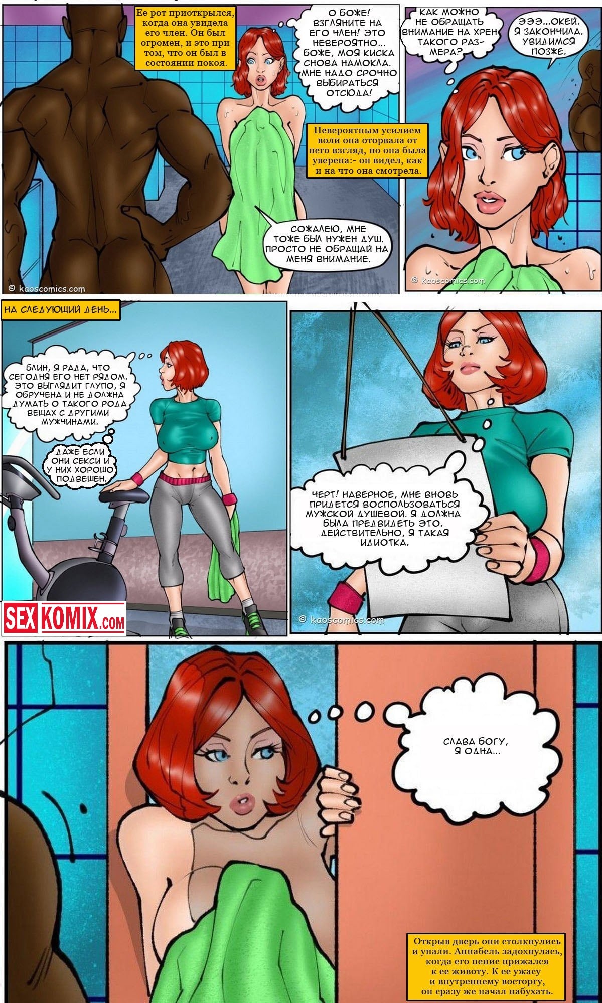 Порно комикс Новая жизнь Аннабель. Муж сказал своей жене, что она начала поправляться и ей нужно сходить в фитнес зал. Девушка послушала своего мужа и отправилась в самый лучший спортивный зал в городе, там ей предложили заниматься с личным тренером. Девушка согласилась и была приятно удивлена, когда увидела своего тренера, им был накаченный чернокожий парень, его огромный член выпирал из обтягивающих лосин. Всю тренировку она смотрела на его штаны, и парень это заметил. Позже он предложил ей выпить коктейль, и это привело к сексу.