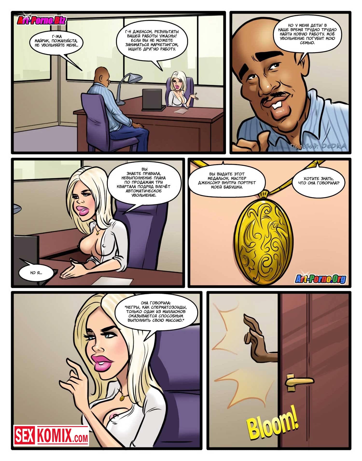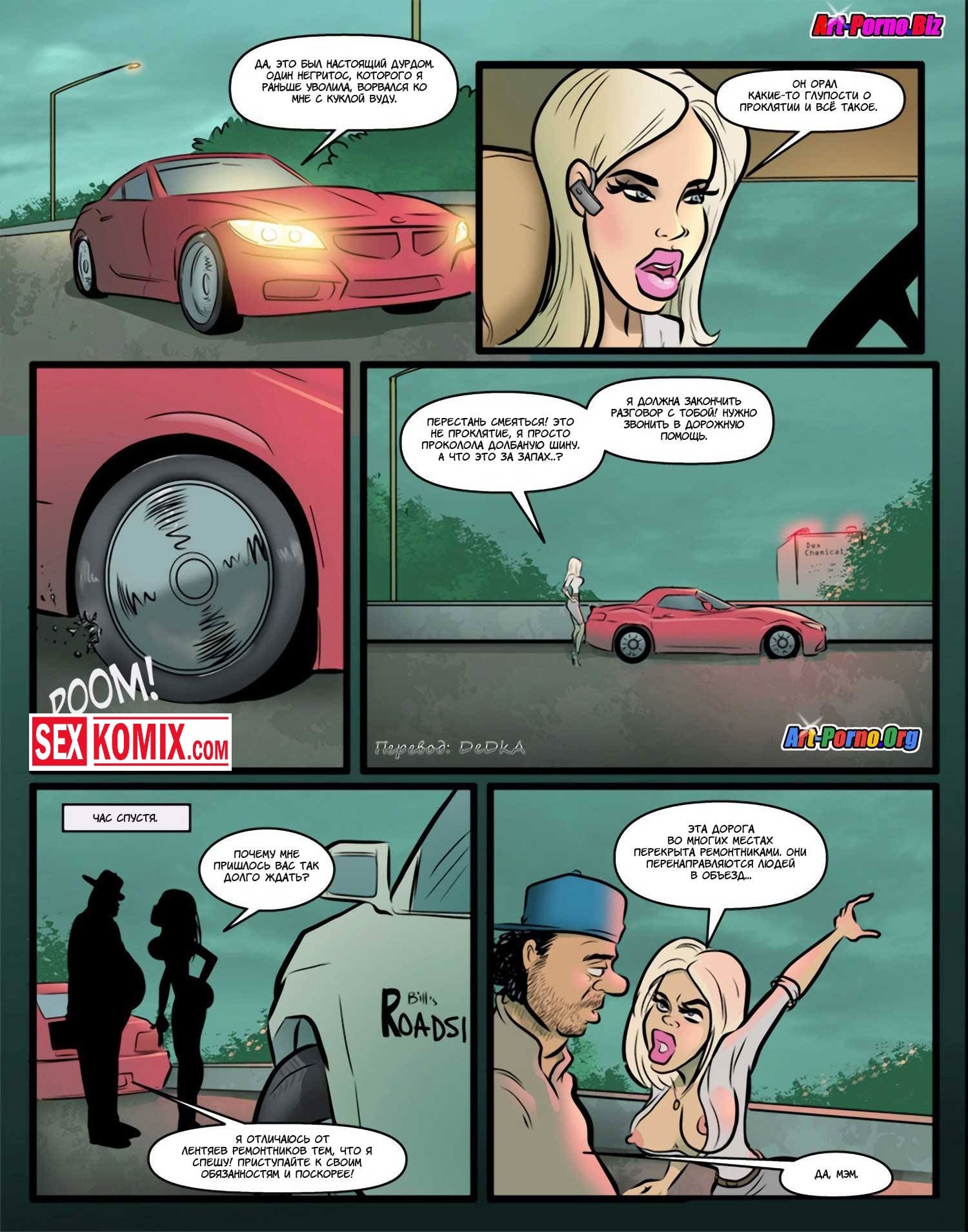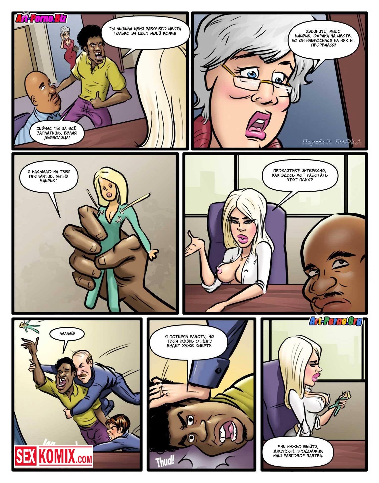 Порно комикс Проклятие чёрного члена. Сексуальная блондинка с большими сиськами пришла на новое место работы. Она не знала, что раньше там работал чернокожий парень, и его уволили. Он проник в её кабинет и назвал на девушку проклятие, но охрана задержала его и вывела из здания. Девушка не верила в это, но когда вечером поехала домой её машина сломалась, и пришлось вызывать эвакуатор. Приехал чернокожий парень, который сразу положил глаз на сексуальную девушку. А когда транспортировать машину в автосервис предложил ей заняться сексом. Девушка с радостью согласилась, такое проклятье ей было по душе.