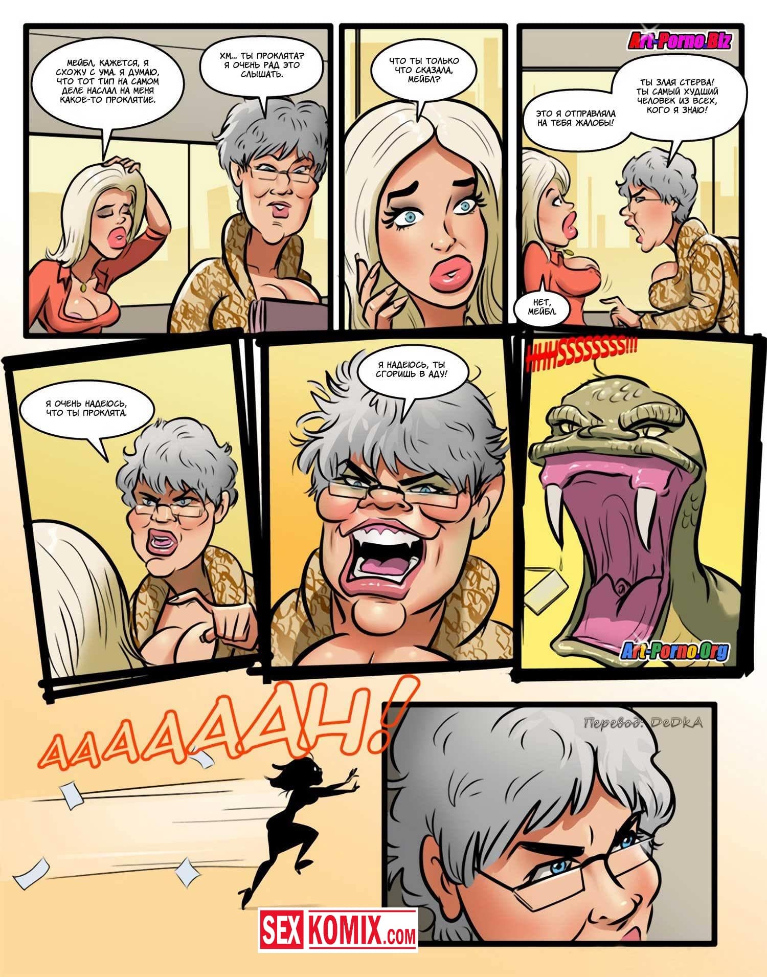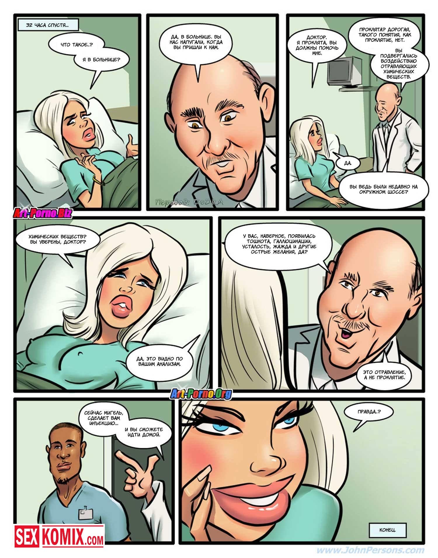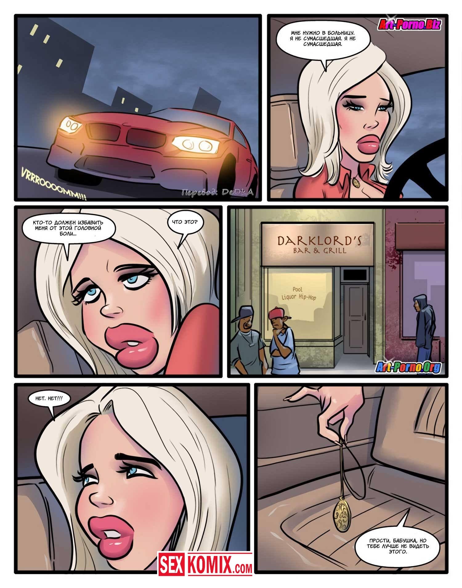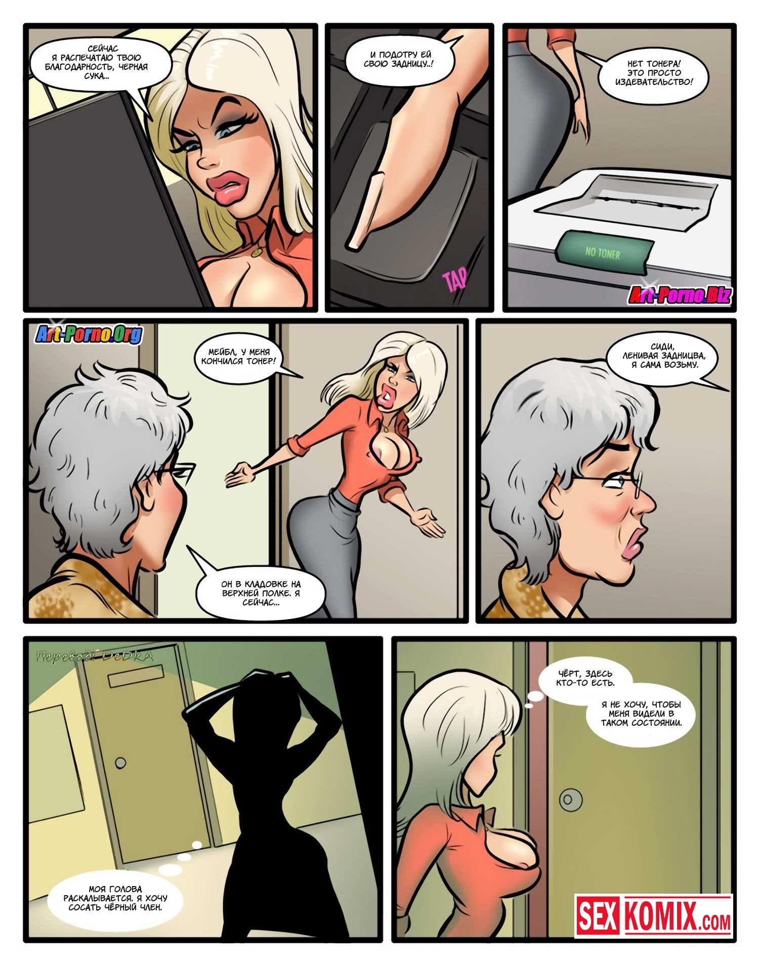 Порно комикс Проклятие чёрного члена. Сексуальная блондинка с большими сиськами пришла на новое место работы. Она не знала, что раньше там работал чернокожий парень, и его уволили. Он проник в её кабинет и назвал на девушку проклятие, но охрана задержала его и вывела из здания. Девушка не верила в это, но когда вечером поехала домой её машина сломалась, и пришлось вызывать эвакуатор. Приехал чернокожий парень, который сразу положил глаз на сексуальную девушку. А когда транспортировать машину в автосервис предложил ей заняться сексом. Девушка с радостью согласилась, такое проклятье ей было по душе.