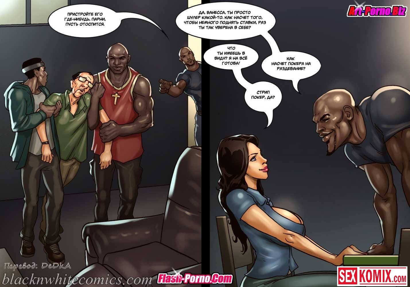 Порно комикс Игра в покер. Часть 2. Покер гейм. Ставки повышаются. После того как простой парень играл в покер с чернокожими ребятами, он очень сильно задолжал. И чтобы отыграться они устроили новую партию у него дома. Во время игры мужчина снова стал проигрывать, и чтобы разрядить обстановку к ним пришла жена проигравшего. Она очень сексуальная девушка с большими сиськами, чернокожие парни сразу обратили на неё внимание и захотели её трахнуть. Именно для этого она туда и пришла, после того как они уже занимались горячим сексом, к ним пришла ещё и её подруга и стало еще веселей.