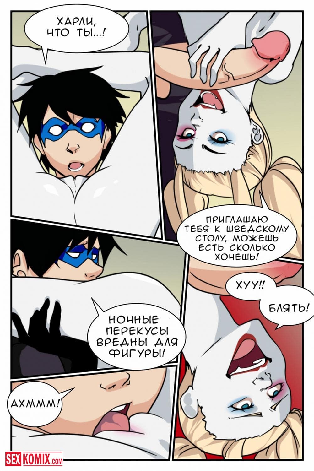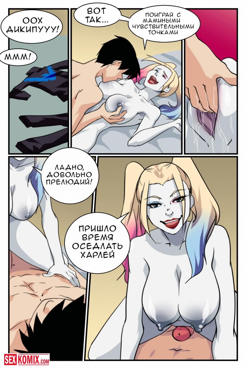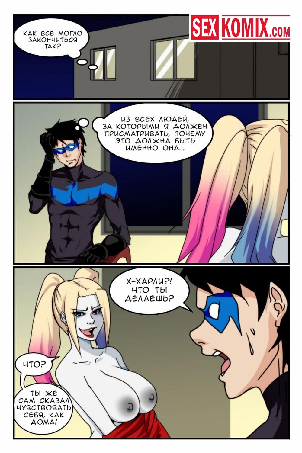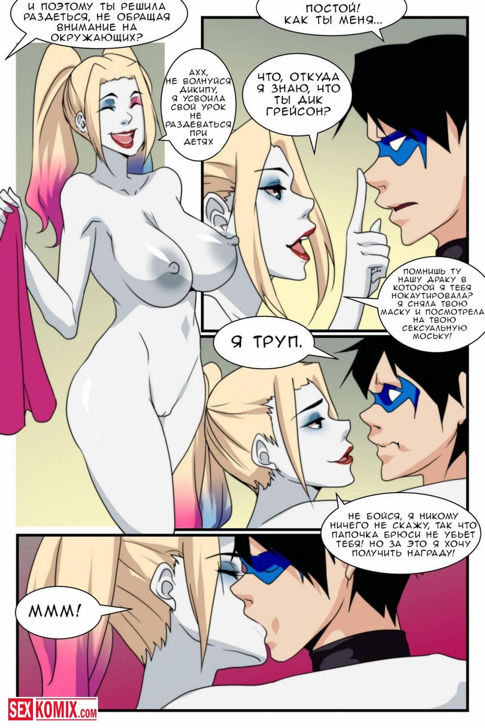 Порно комикс Дик и Харли Квинн. Самый близкий помощник Бэтмена по имени Дик расследует очередной преступление и его след приводит сумасшедший и очень сексуальные девушки, по имени Харли Квинн. Девушка выглядит очень сексуально, ни один мужчина не может не обратить на это внимание. Дик понимаю прекрасно, что она преступница, но всё же не может её остановить. Потому что красотка начинает его соблазнять, и они занимаются горячим сексом, после которого она сбегает от него.