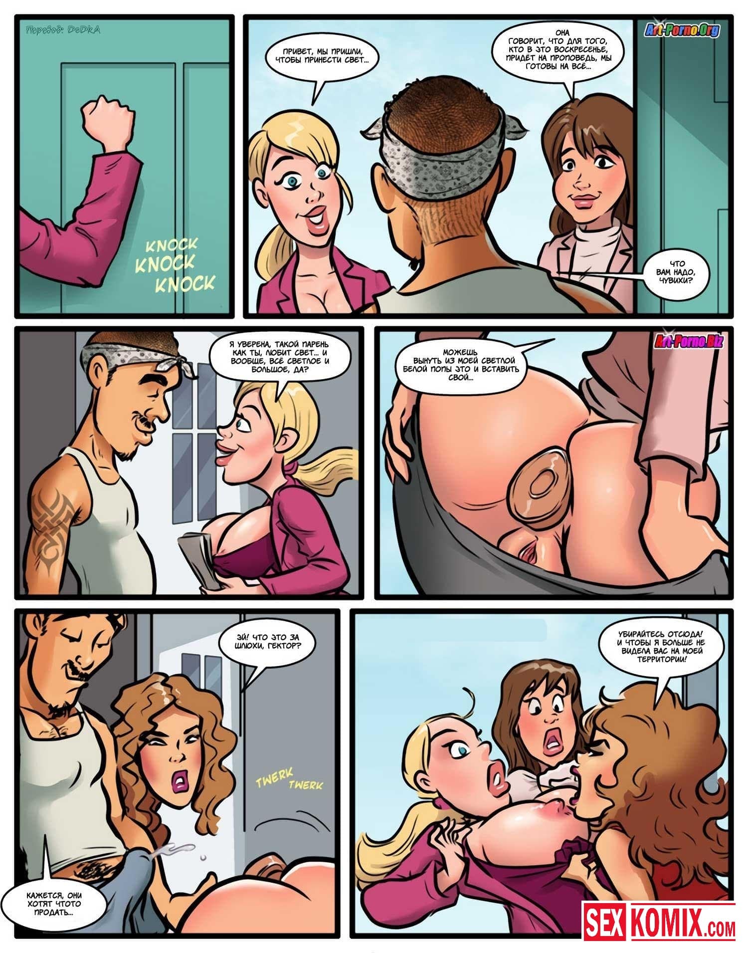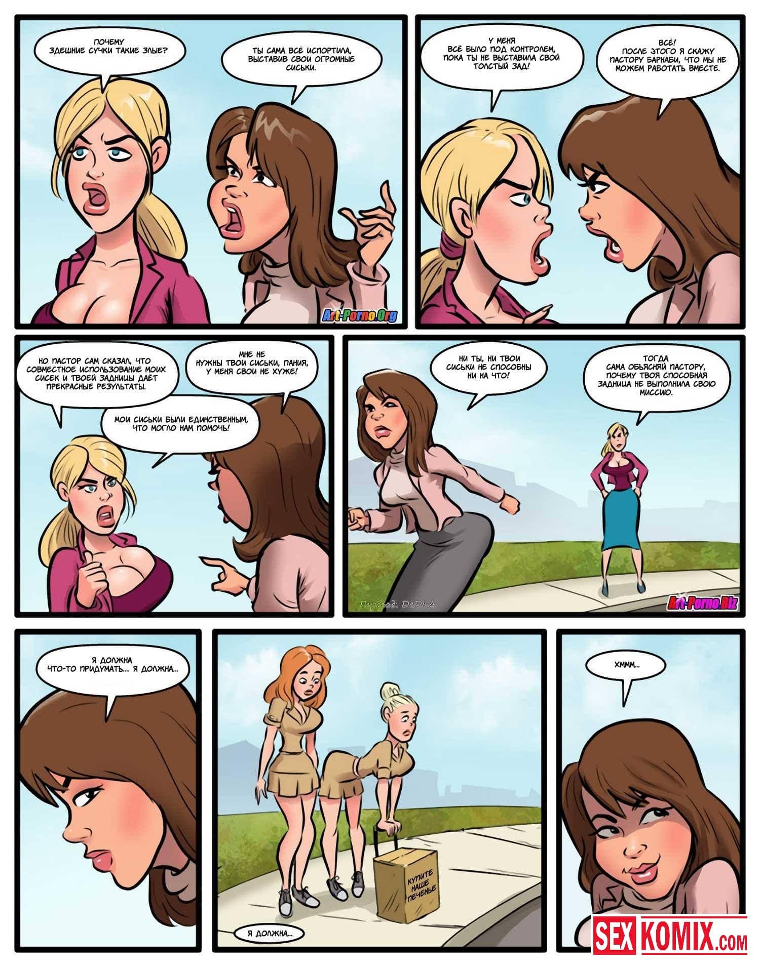 Порно комикс Лазейка в рай. Часть 4. Очень сексуальная блондинка ходит по домам и просит сборы для церкви. Поскольку ей очень часто попадаются парни, девушка решила одеться более вызывающе, сделать свою грудь больше, чтобы обратить на нее внимание парней. Ей это очень хорошо удалось, так как пожертвование она начала собирать очень крупными суммами. Но при этом ей приходилось неплохо работать, в основном удовлетворять этих самых парней.