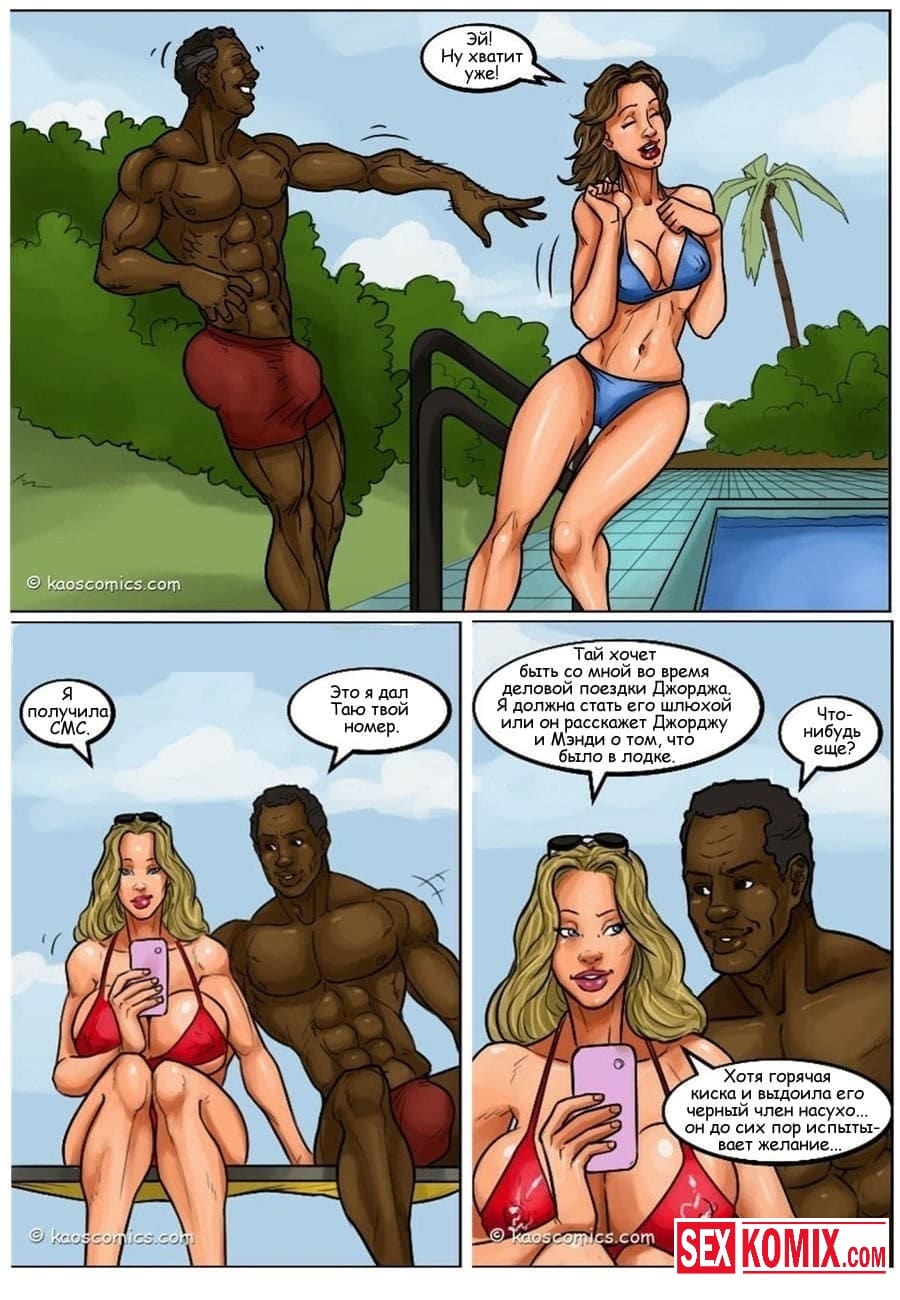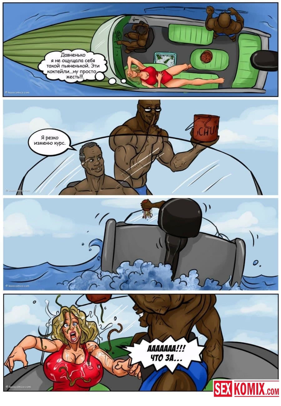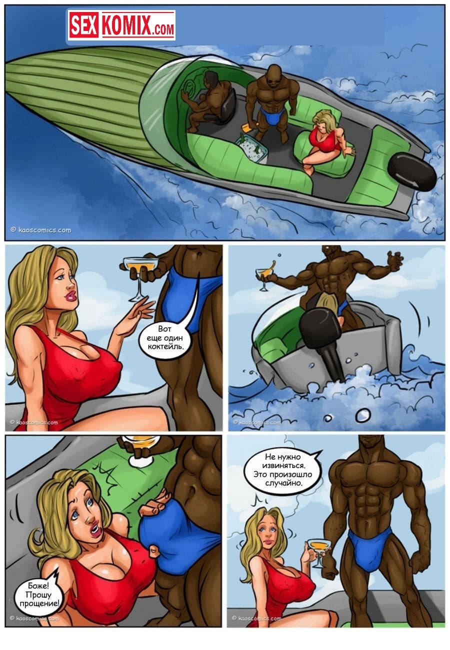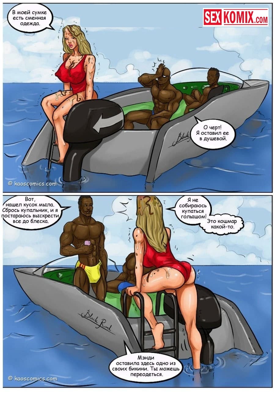 Порно комикс Сговор против бикини. Два чернокожих парня пригласили на свою яхту очень сексуальную девушку с большими сиськами и стройной фигурой. Она загорала на солнышке, парни специально обрызгали её водорослями. Девушка пошла мыться в воде, пока она мылась ей пришлось раздеться догола, и все и нижнее белье унесла вода. Когда она вернулась на яхту, эти парни уже ждали ее со стоящими членами, и начался настоящий разврат.