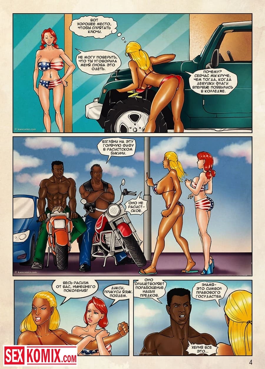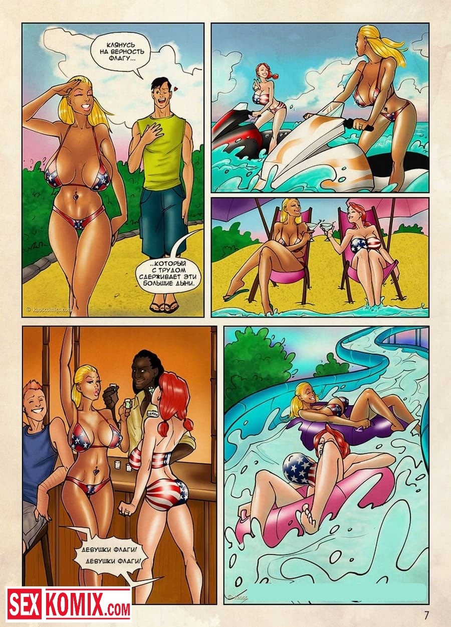 Порно комикс Девушки Флаги. Часть 1. Две развратные подружки с очень красивыми телами, большими сиськами и задницами, гуляли по городу, одевшись в купальники с расцветками разных стран. Они поднимали настроение парням живущим в этом городе. А когда проходили мимо городского праздника их пригласили поучаствовать в конкурсе, в котором нужно было танцевать на сцене. Девушки с радостью согласились и в танце демонстрировали свои сексуальные тела, после этого с ними познакомилась двое чернокожих парней, которые занялись ними страстным сексом.