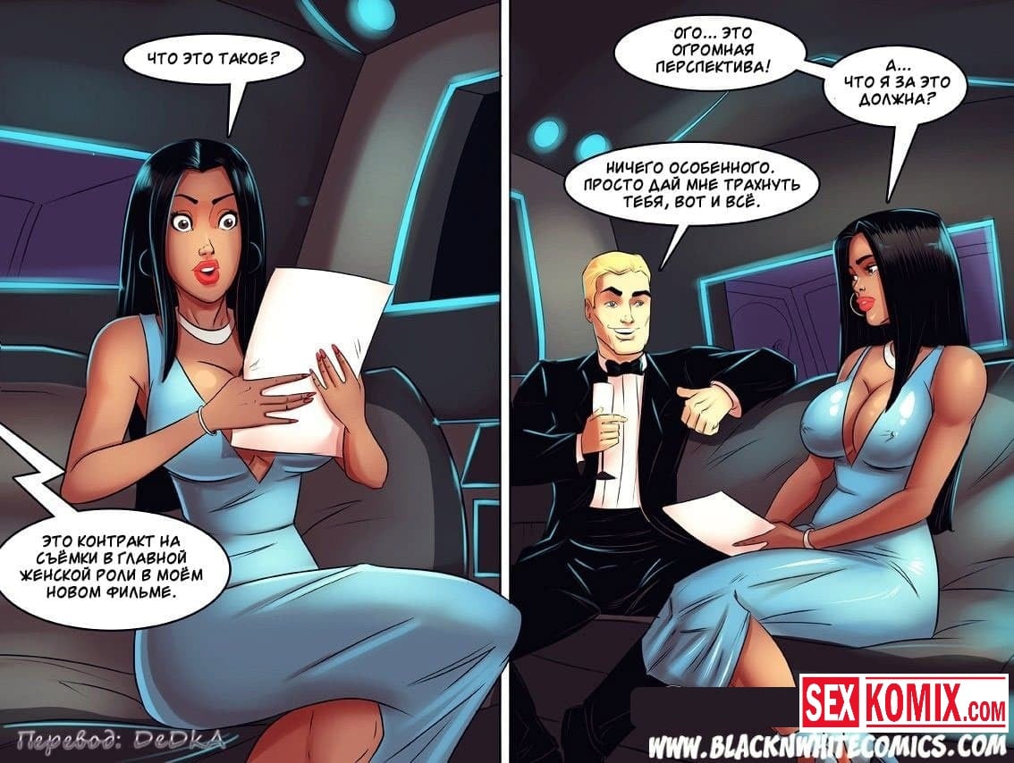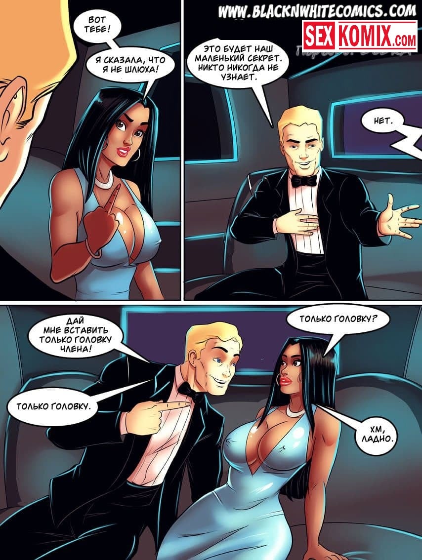 Порно комикс Красная дорожка. Известный голливудский актёр был приглашен на престижную церемонию вручения, ему обязательно нужно было вторая половина для этого мероприятия. Парень решил позвать свою чернокожую подругу, когда они встретились и вместе ехали в лимузине между мужчиной и женщиной промелькнула страсть. Они набросились друг на друга, и жадно целуя в губы снимали одежду. Пока они ехали до церемонии все время занимались сексом.