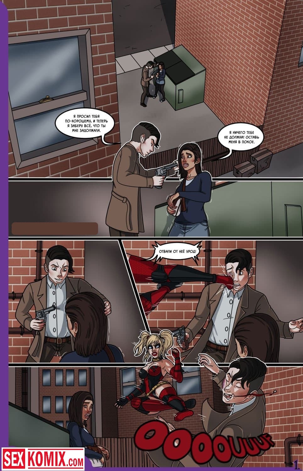 Порно комикс Влюбленный Бэтмен. Человека-летучую мышь вызвали на очередное место преступления. Когда он пришёл, то обнаружил грабителя. Он похитил много денег из банка и пытался скрыться. На его пути возникла сексуальная красотка по имени Харли Квинн она вырубило бандита своей битой, и связала его. Бэтмен все это увидел, он предложил девушке стать его напарницей. Но она отказалась, вместо этого красотка согласилась провести время супергероем, и в конце вечера позволила ему себя трахнуть.