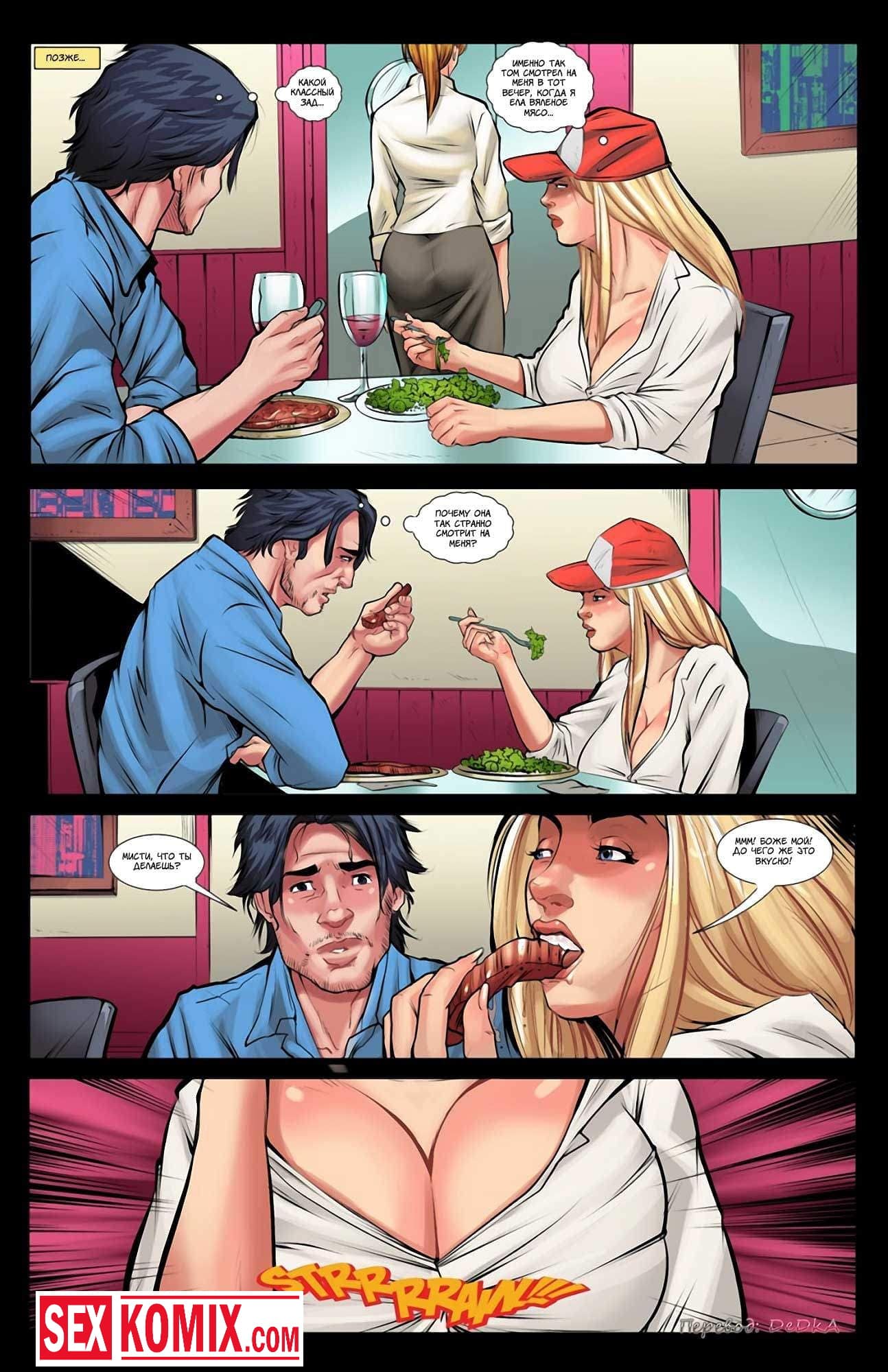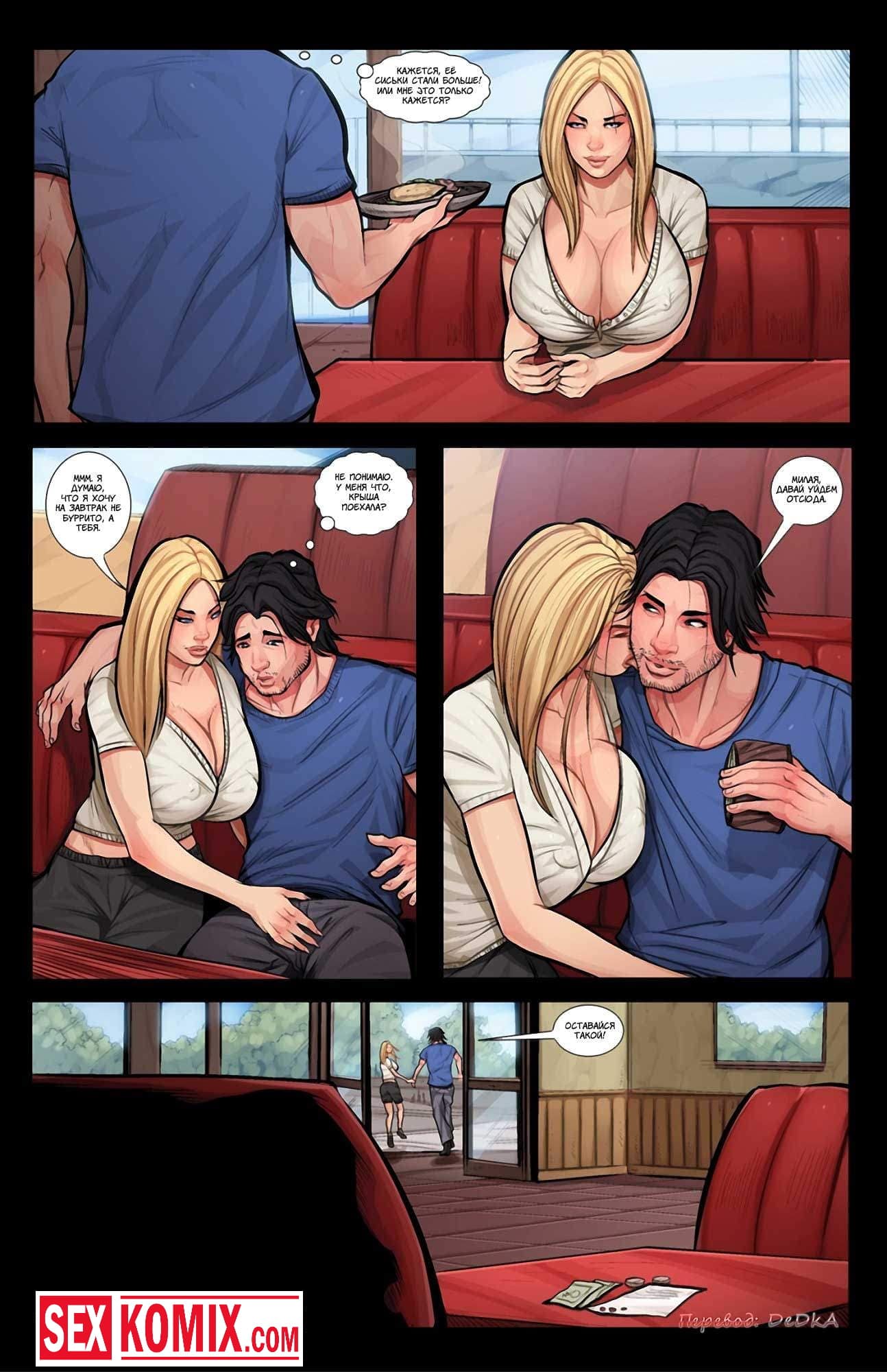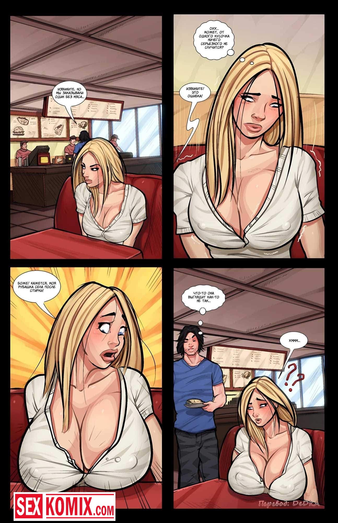 Порно комикс Только не мясо. Часть 1. Парень познакомился через интернет с очень сексуальной девушкой и они пошли на первое свидание в ресторан. Он заказал еду для обоих и девушки принесли мясо. Но парень не знал, что на него у красотки аллергия и после того как она съедает хотя бы кусочек, у неё очень сильно вырастают сиськи. Девушка попробовала несколько кусочков мяса и неожиданно её грудь начала рости. Увидев это, парень отвел её в свою машину хорошенько трахнул.