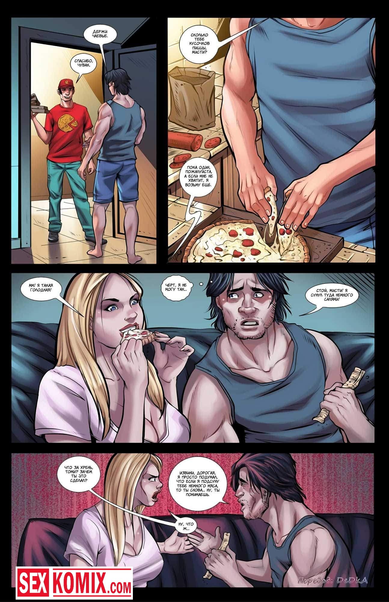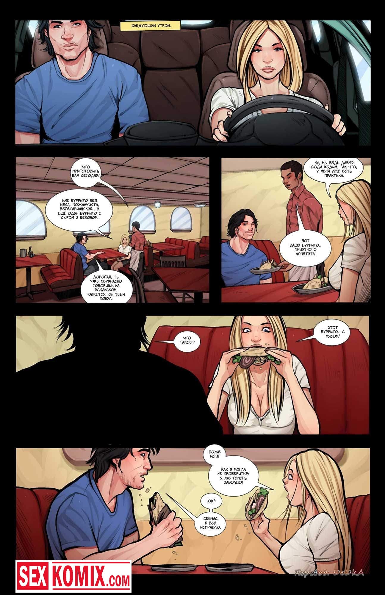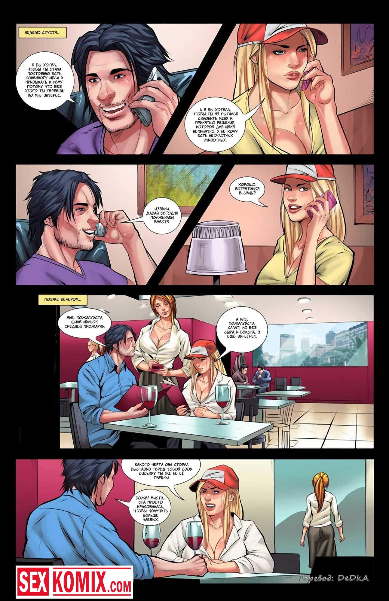 Порно комикс Только не мясо. Часть 1. Парень познакомился через интернет с очень сексуальной девушкой и они пошли на первое свидание в ресторан. Он заказал еду для обоих и девушки принесли мясо. Но парень не знал, что на него у красотки аллергия и после того как она съедает хотя бы кусочек, у неё очень сильно вырастают сиськи. Девушка попробовала несколько кусочков мяса и неожиданно её грудь начала рости. Увидев это, парень отвел её в свою машину хорошенько трахнул.