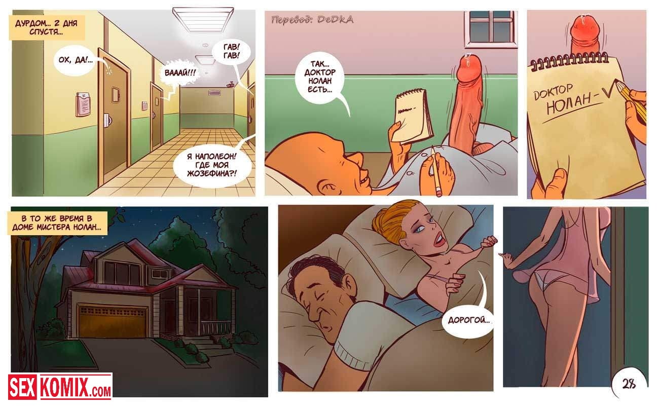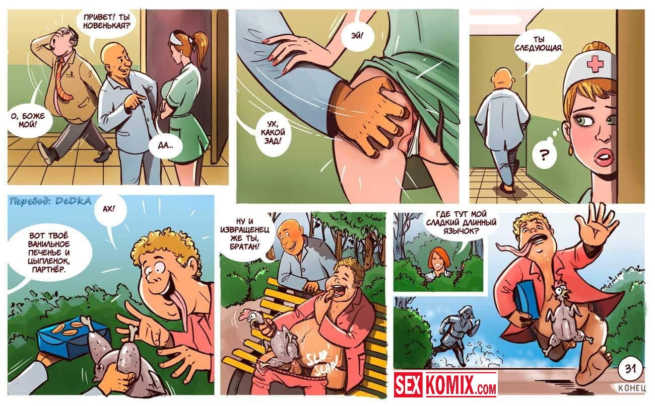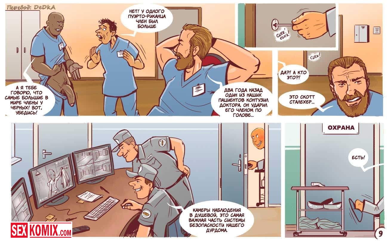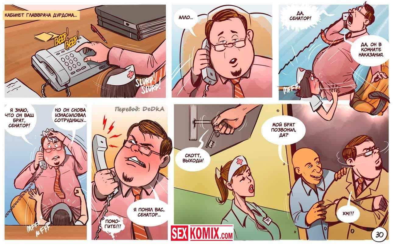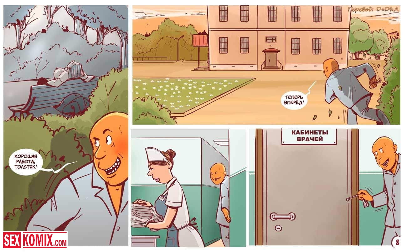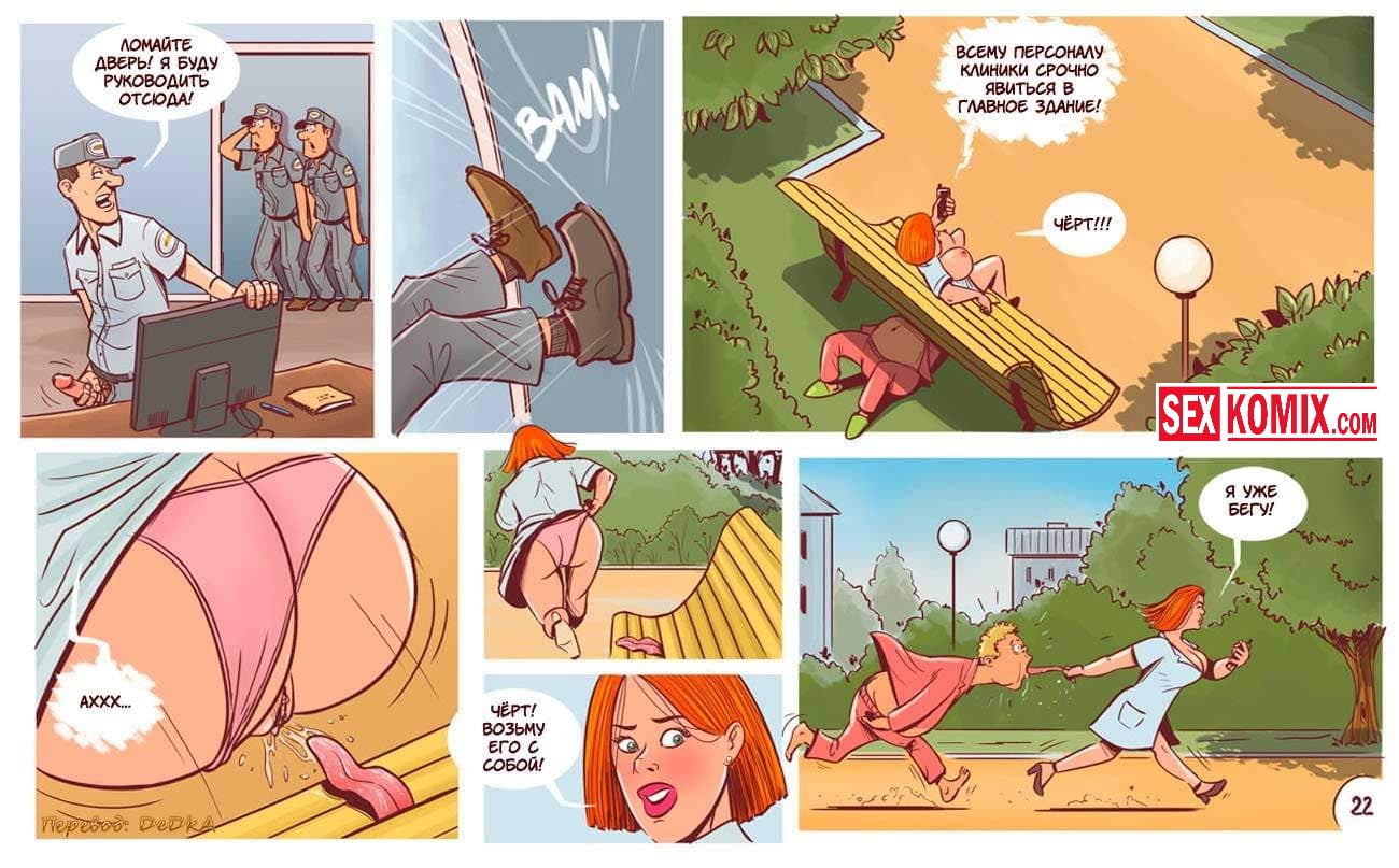 Порно комикс Бунт в дурдоме. Извращенцы из псих лечебницы сбежали из своих комнат и начали приставать к своим надзирательницам. Девушки и женщины сначала испугались, но позже когда мужчины начали активно трахать. Им очень понравилось и они захотели продолжения, девушки уже сами просили что бы их трахали. Они прятались в кустах и за зданиями, что долбиться в тайне от начальства.