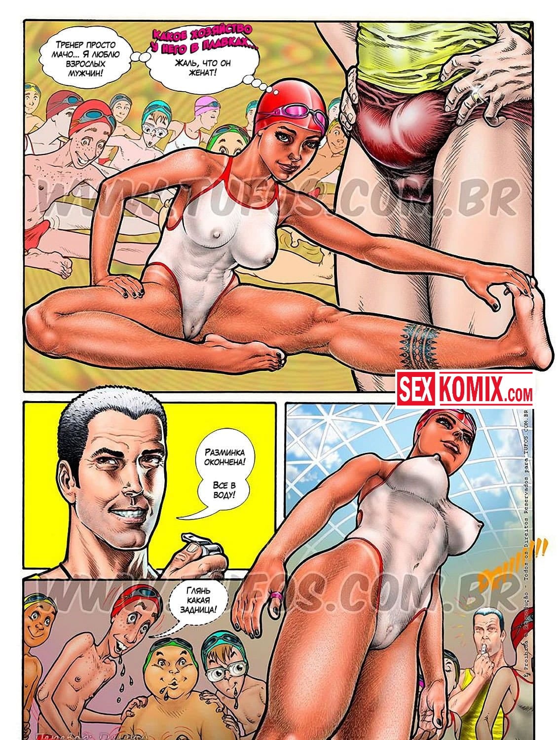 Порно комикс Истории об изменах. Часть 2. Нимфа в бассейне. Сексуальная нимфоманка с обалденным телом натянула на себя развратный купальник и отправилась в общественный бассейн. Когда она вышка к бассейну, все мужика сразу обратили на неё внимание, но эта красотка положила глаз накаченного тренера. Девушка заигрывала с ним, и строили глазки, а когда пошла в душ, он отправился в след на ней.