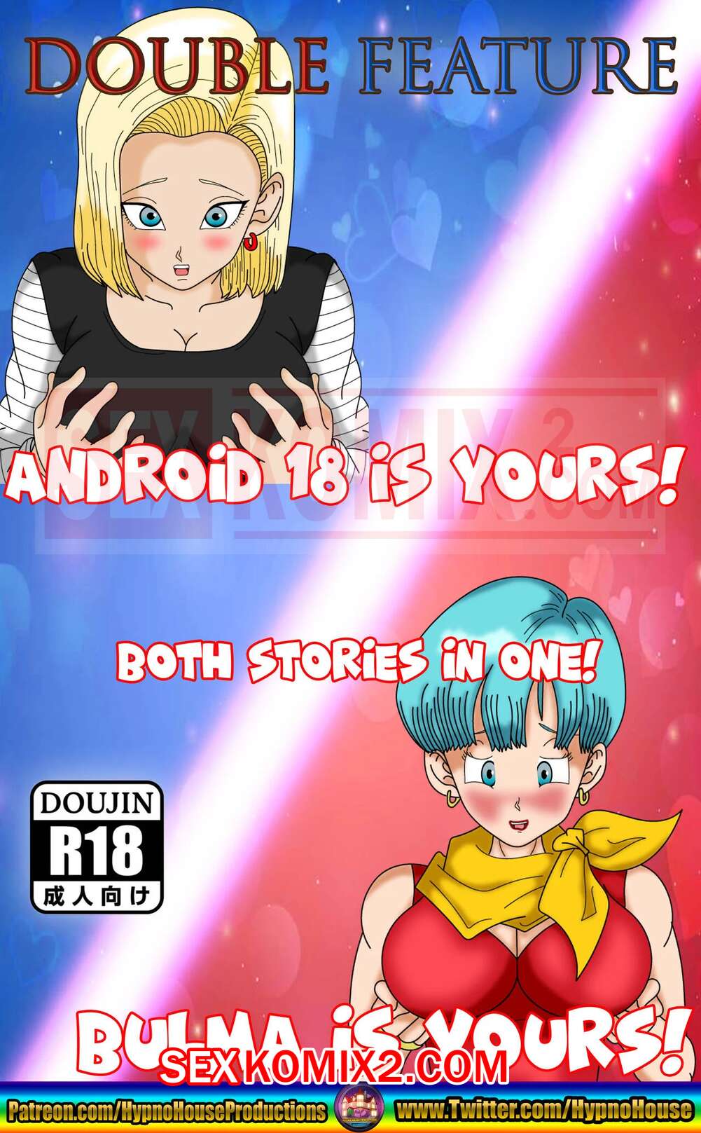 Порно комикс Двойная функция Андроида 18 и Бульмы. Парень затуманил сознание двух сисястых красоток и теперь они стали его секс рабынями. Сучки готовы исполнять все его сексуальные желания, отсасывая его большой хуй и трахаясь с ним.