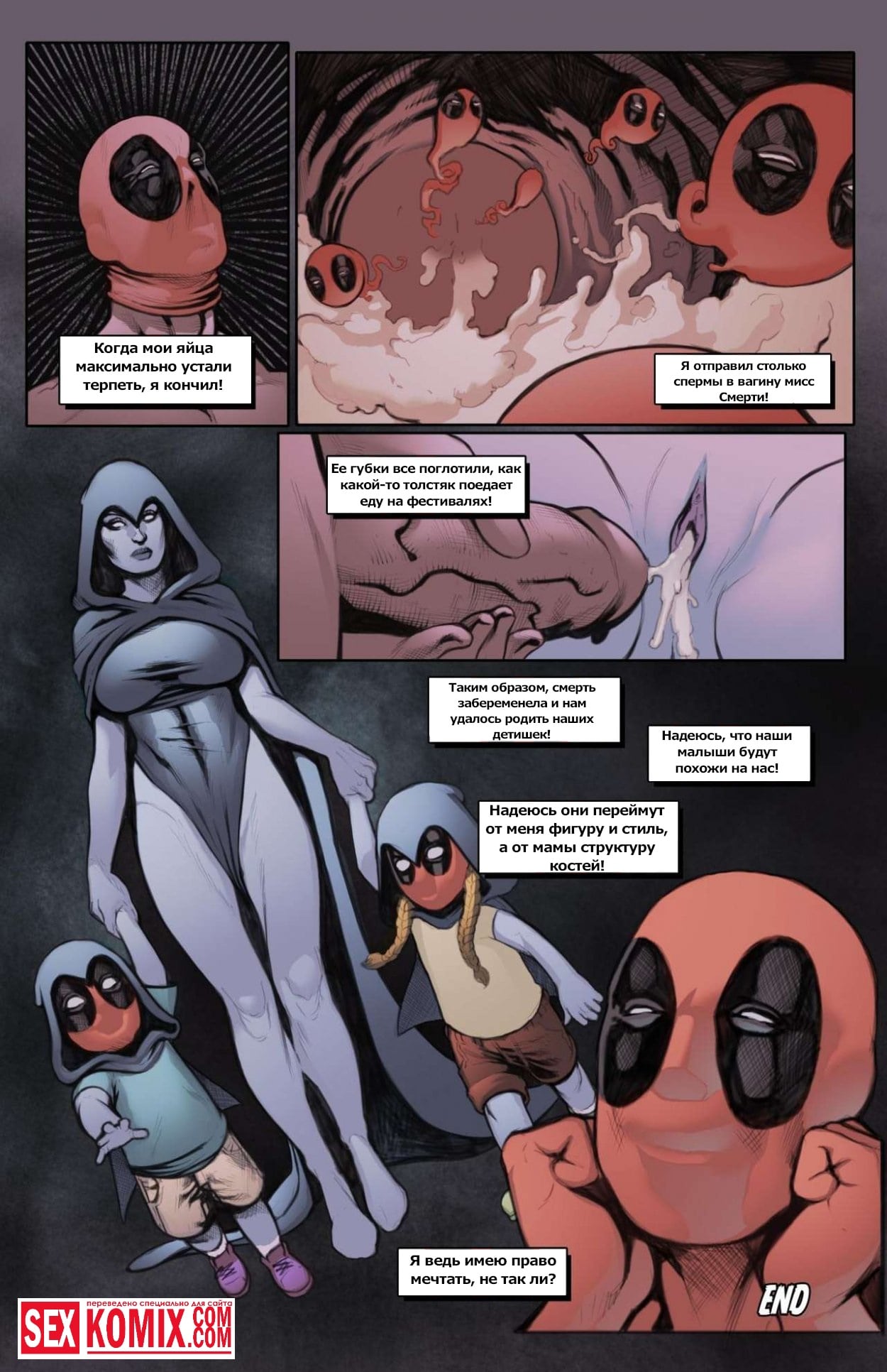 Порно комикс Свидание со смертью. Дэдпул зависал на мосте, как он это любит делать постоянно. Вдруг из ниоткуда пуля попадает в голову и он умирает. И попадает к очень сексуальной женщине по имени Леди смерть. Она сидит на своем троне широко раздвинув ноги, на ней нет трусиков. Дэдпул как заворожённый идёт к ней, вылизывает киску и хорошенько трахает.