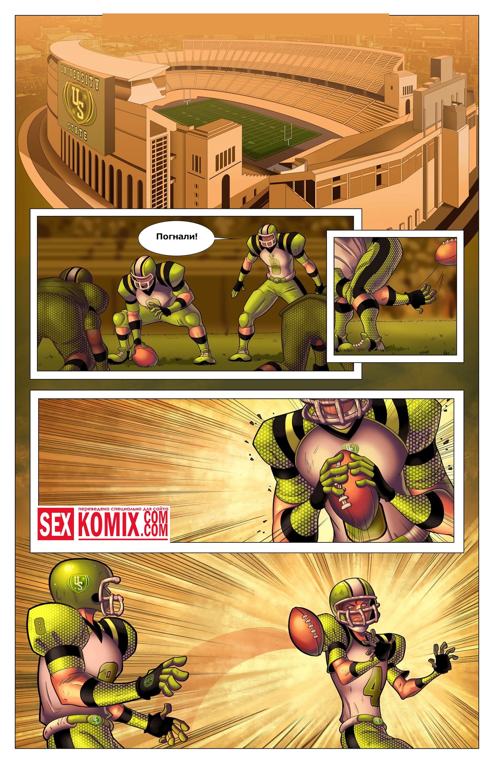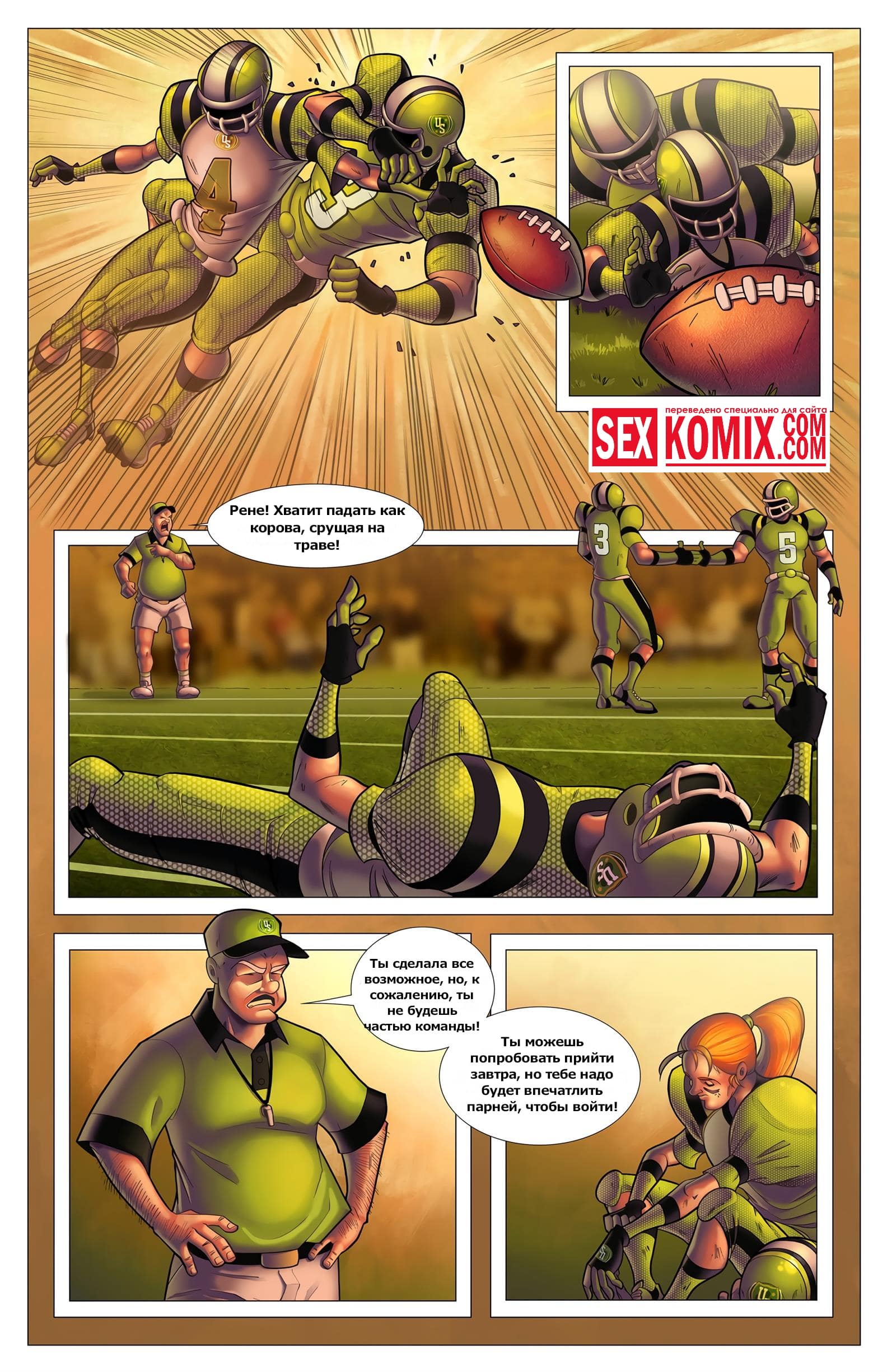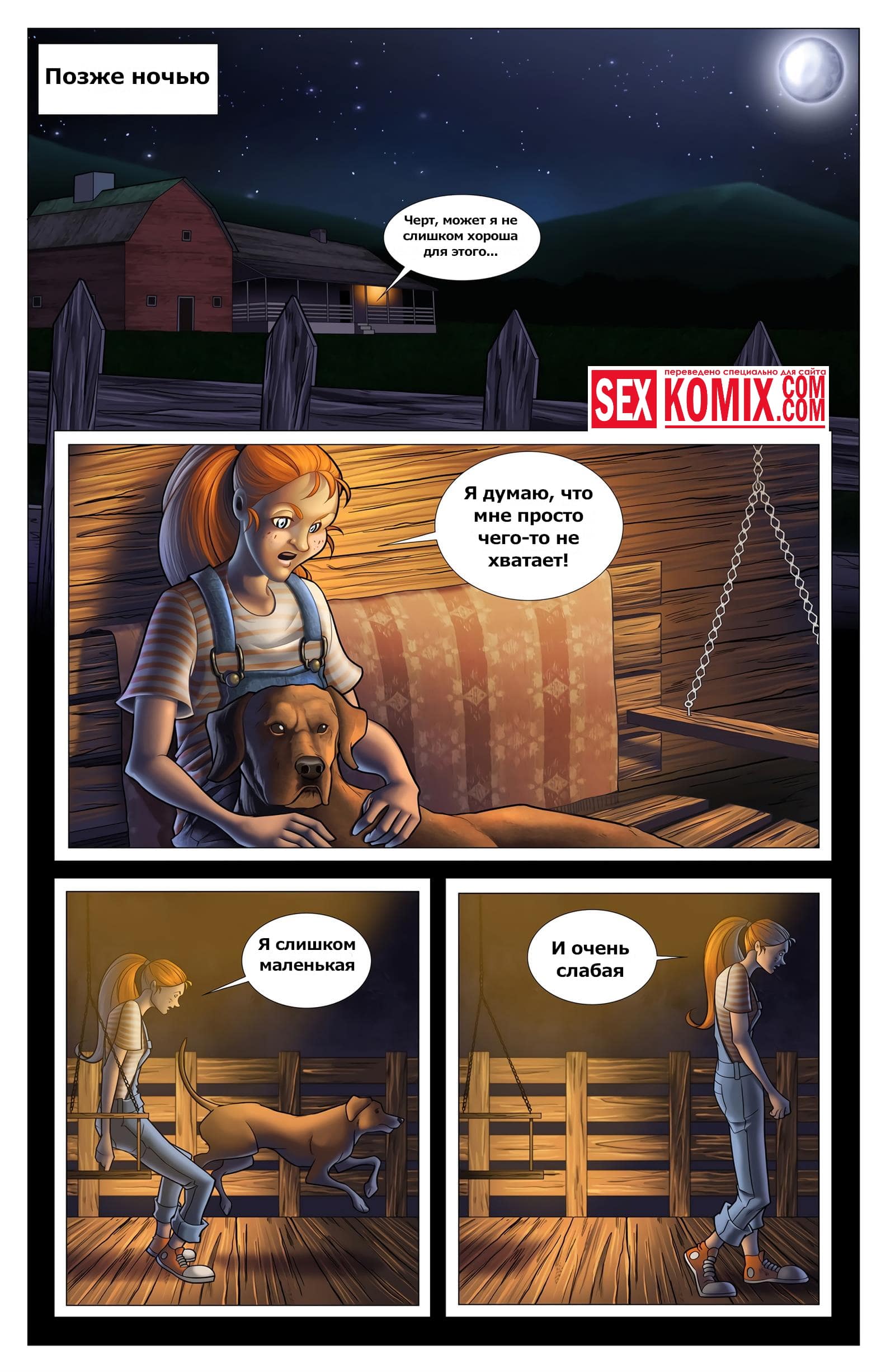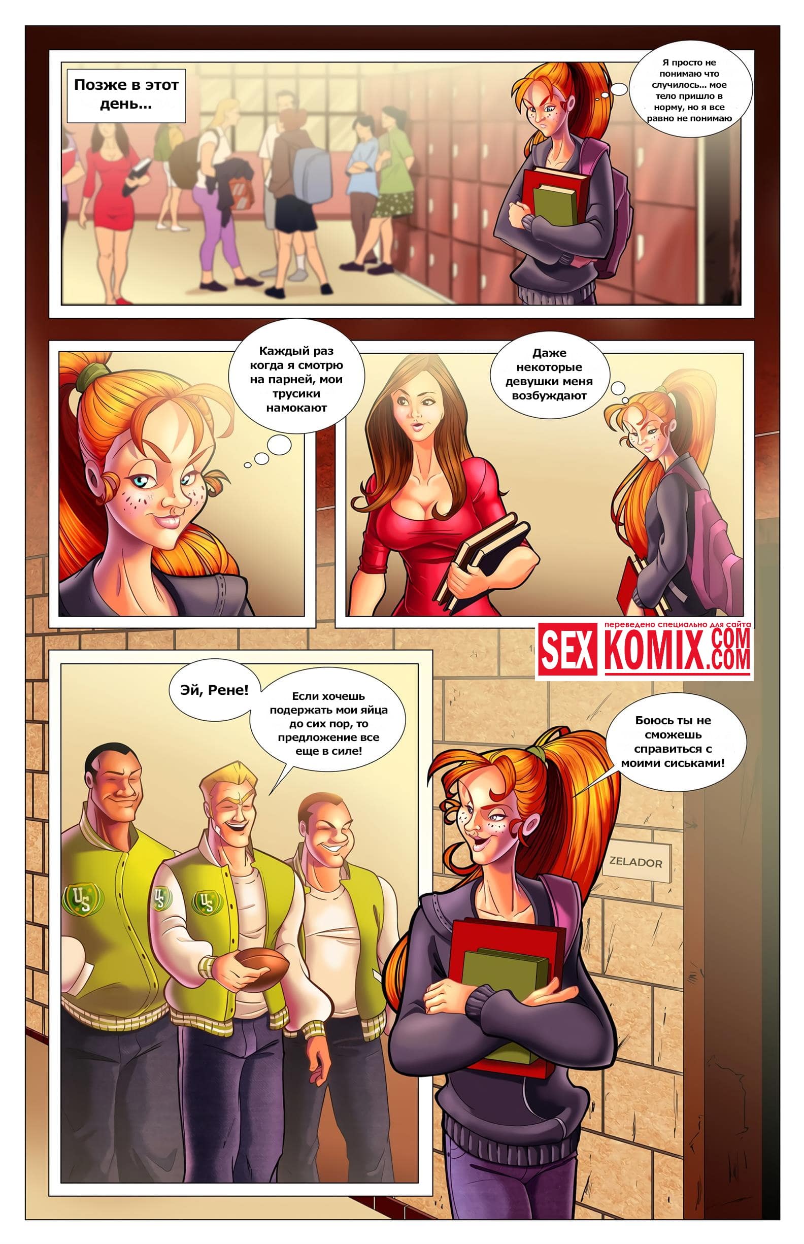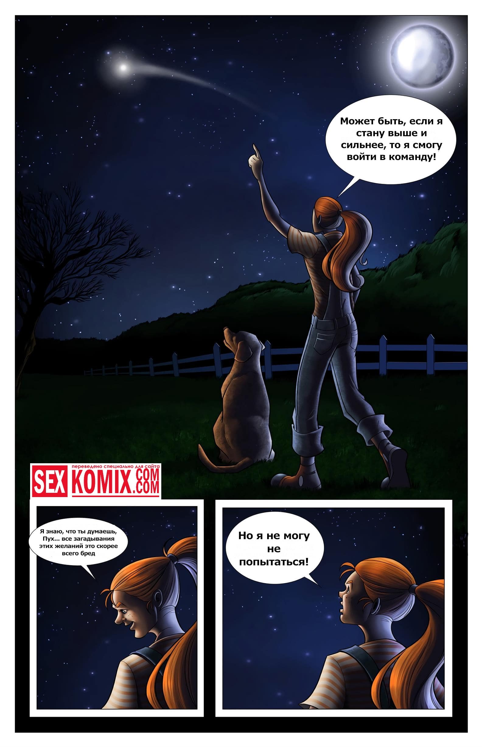 Порно комикс Желание на звезду. Рыжеволосая девушка из деревенского захолустья любит играть в американский футбол вместе с парнями, но они ее считают её сексуальной, так как у неё плоская грудь и худая задница. Однажды ночью, когда она спала в своем доме, услышала какой-то шум за окном. Девушка пошла проверить и обнаружила упавшую с неба звезду. После того как она к ней прикоснулась её тело изменилось, грудь стала пышна. А задница очень сочная и сексуальная.