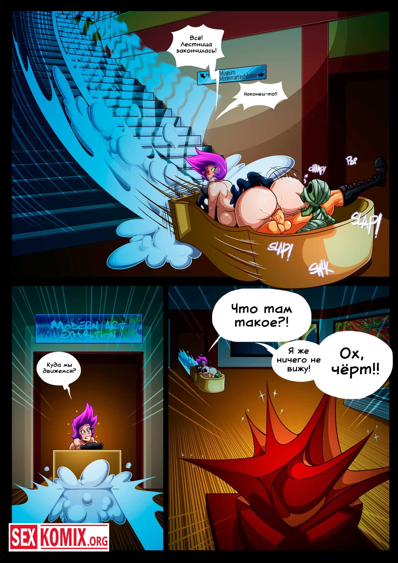 Порно комикс Цепная реакция. Часть 2. Сексуальная девушка с большими сиськами работает ночным сторожем в музее. После того как она заступила на смены прошло несколько часов, и когда стемнело в музее стали происходить странные вещи. Какие звуки раздавались в темных коридорах, оказалось это грабитель проник в здание. Но когда он увидел красотку охранницу, захотел трахнуть её.