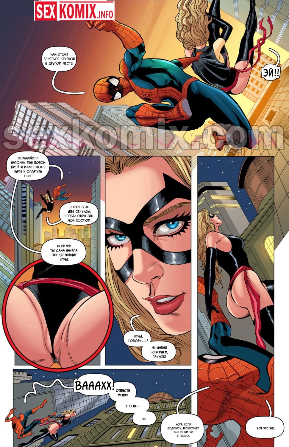 Порно комикс Невероятный человек паук и Мисс Марвел. Этот комикс о том, как Питер Паркер влюбился в коллегу по супер геройству мисс Марвел. Однажды на очередном романтическом свидании, ужиная в кафе, сексапильная женщина немного раззадорила Питера, да так, что ему срочно захотелось уединиться с дамой. Но она всегда хочет, чтобы было так, как желает она, поэтому возбужденному паучку придется приложить все усилия, чтобы, наконец, трахнуть аппетитную героиню.
