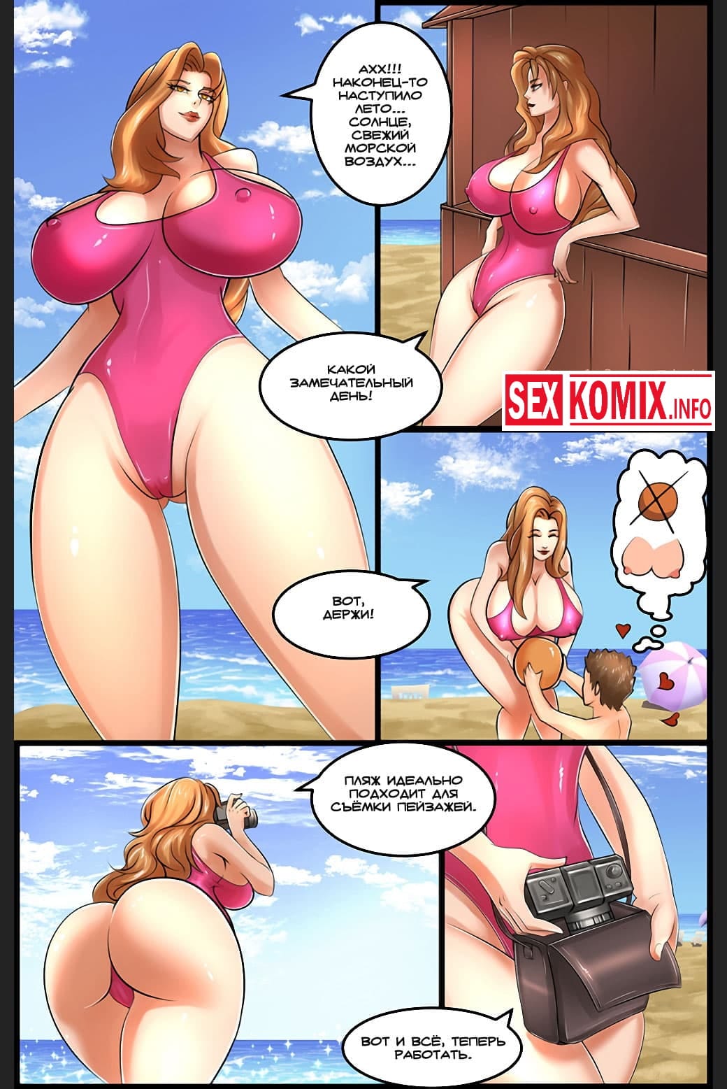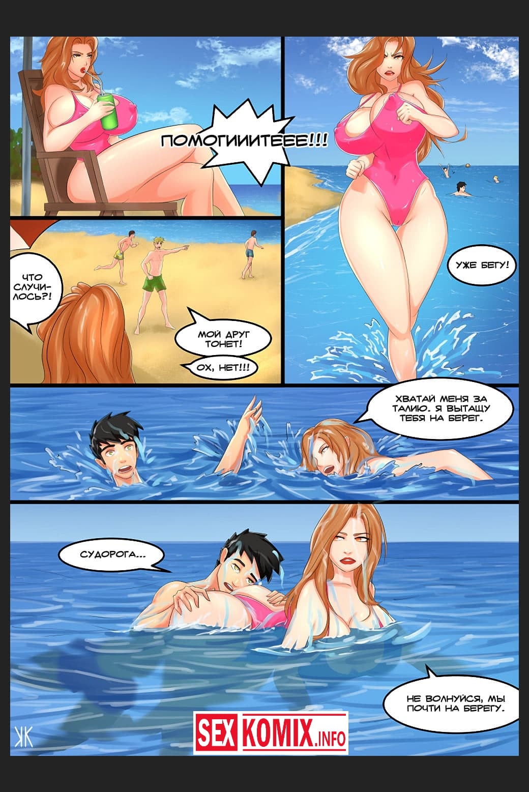 Порно комикс Спасательница. Парень купался в море и увидел сексуальную спасательницу, она наблюдала за купающимися, чтобы никто не утонул. Развратный парень придумал план как трахнуть красотку, он начал кричать и звать на помощь. Чуткая девушка быстра оказалась рядом и вытащила хитреца. Она увела его в мед пункт, где парень соблазнил девушку и трахнул.